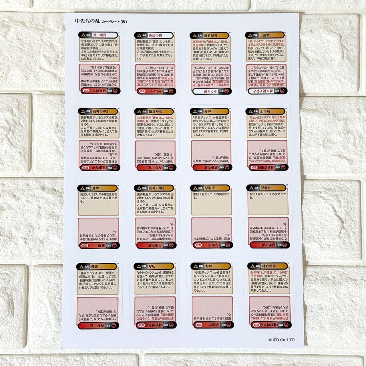 内容物:解説書1冊(ゲームルール8ページを含む)、マップ1枚(A3判)、駒シート1枚(駒60個)、カードシート1枚(16枚分)