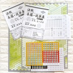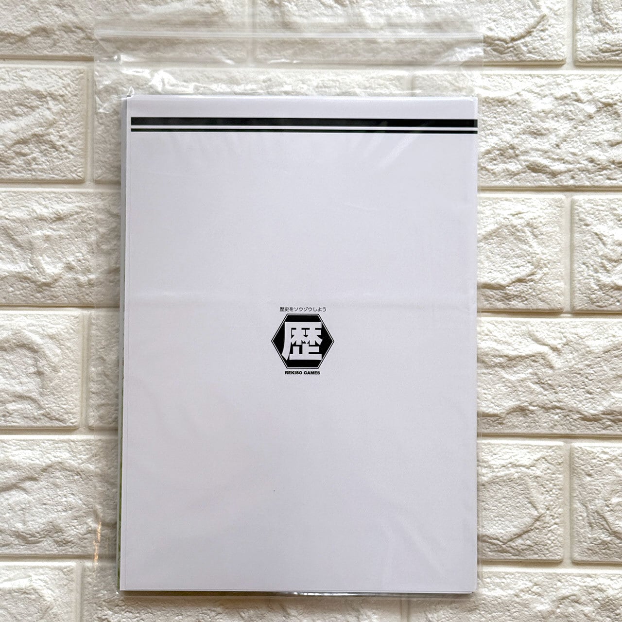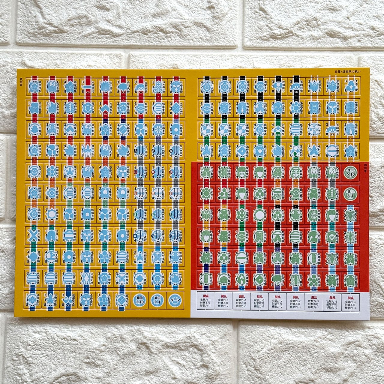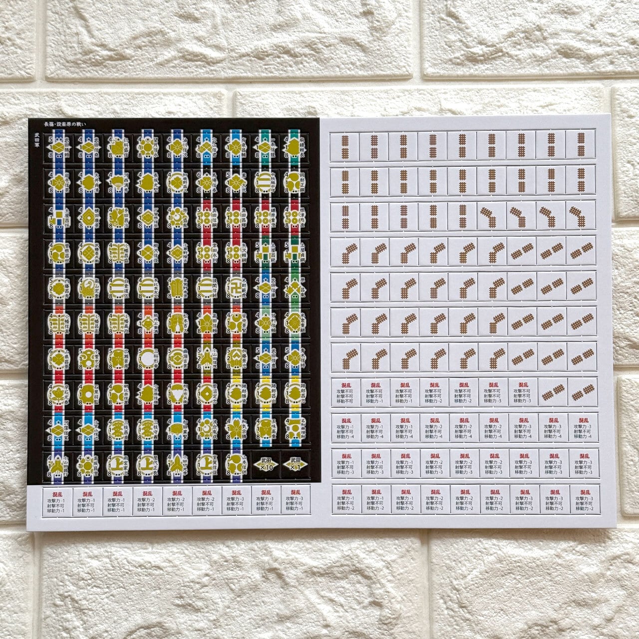 内容物:基本ルール1冊(8ページ)、専用ルール1冊(8ページ)、ハーフマップ2枚(A2判)、駒シート2枚(駒の合計396個)、チャート2枚