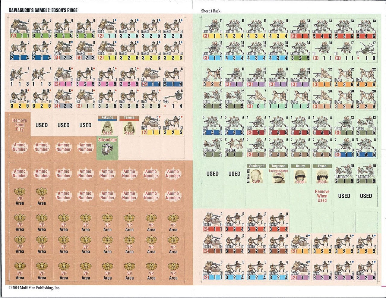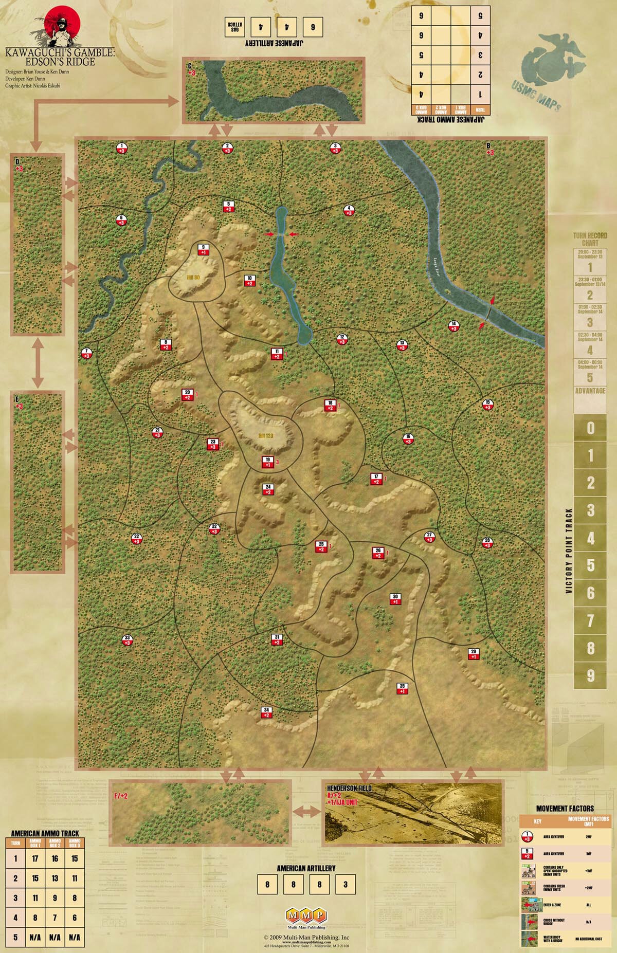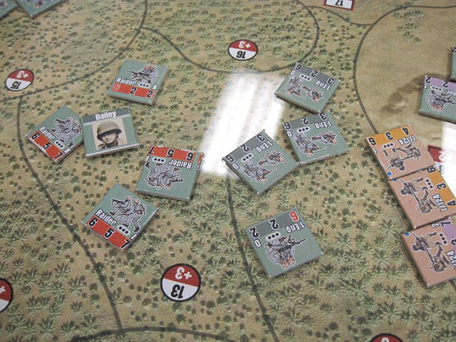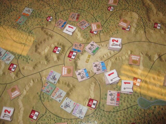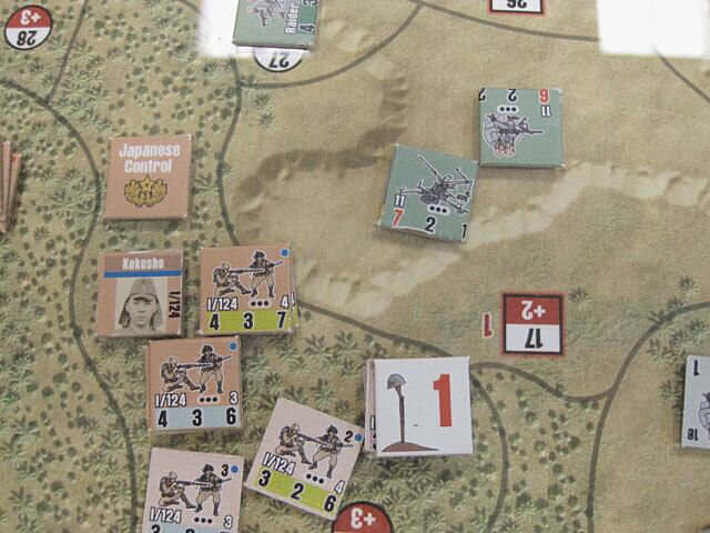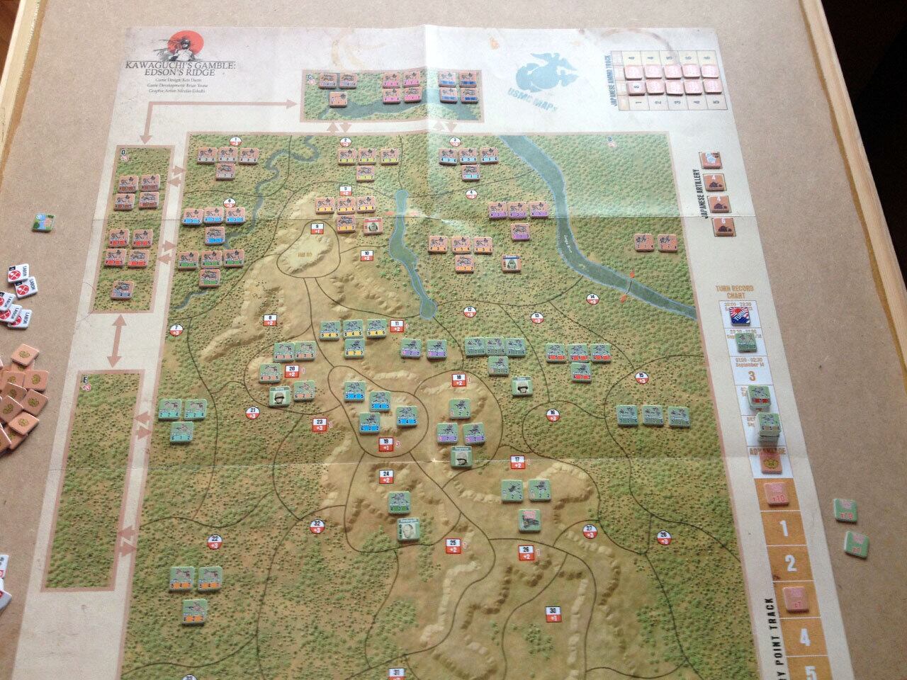 川口支隊といえば、ガダルカナル島の戦いにおける日本軍の第一次総攻撃の主力であり、ブラッディリッジの戦いは有名です。ゲーム盤は下が北を向いており、 日本軍が上(南)からヘンダーソン飛行場を目指して進撃していきますが、強力な米軍の抵抗に遭い、一部の部隊はヘンダーソン飛行場南端に到達したものの混 戦の末に日本軍は敗走しました。