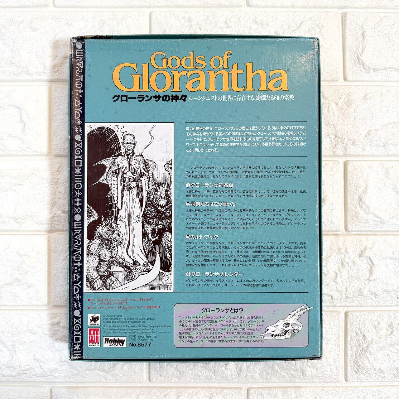 『グローランサの神々』は、名作ファンタジーRPG『ルーンクエスト』の舞台“グローランサ”に息づく神々と宗教体系を徹底解説する資料集です。