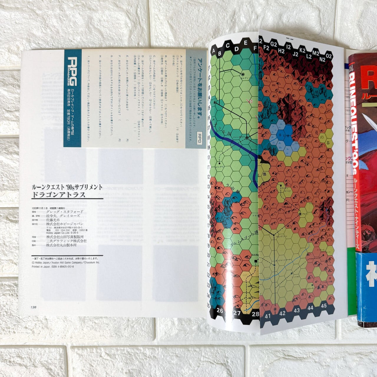*中古品 ルーンクエスト'90s(TRPGルールブック)とドラゴンアトラス(ワールドガイド)のセット。 ルーンクエスト'90sは、90年代展開期の公式ルールブックで、キャラクター作成から戦闘・魔術までを網羅。 ドラゴンアトラスは、グローランサ世界をビジュアルで解説する資料集。